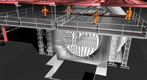 The two platforms, suspended from existing structures, will provide support for the replacement of the upper feeder tubes and associated components within the space-limited reactor core.
