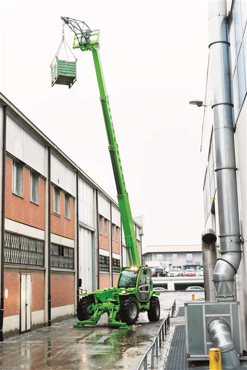 Merlo’s Roto 50.35 S Plus offers a 115-foot lift, 89-fot reach, 360-degree turret rotation, 170 hp, hydrostatic transmission, 20-degree tilt cab and a maximum capacity of 10,900 pounds. An Advanced Safety System displays all machine parameters in real time. Chassis design has increased structural strength and weight for better balance, the company says. All functional controls, such as stabilizer placement, machine suspension and an electronic joystick, are integrated into the multifunctional armrest.