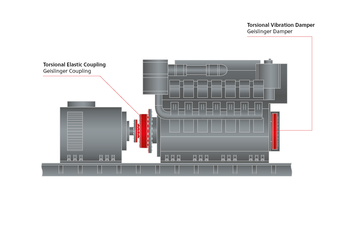 Different pressure curves of this single cylinder research gas engine have been measured. Different types of Compressed Natural Gas up to an indicated mean effective pressure (IMEP) of 34 bar have been used to study its effect on the Torsional Vibrations (TV). The combustion of hydrogen was also used for these studies. These pressure curves were transferred to engine excitations and applied on a TV model of a regular 16V genset application. The Geislinger Damper (below, left) and Coupling (left of the engine) are marked in red.
