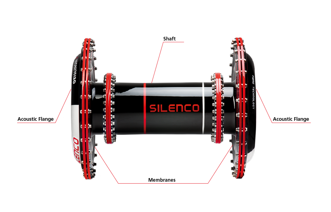 Not only the torsional vibration levels might increase significantly, but also the structure-borne noise from the engine into the ships’ hull. To minimize the transfer of the structure-borne noise along the powertrain, the Geislinger Silenco Coupling is a powerful option. The coupling is made from carbon and glass fiber combined with elastomer layers. The segments are connected by steel bolts. The figure below shows a picture of such a coupling. The outer sides are the acoustically optimized flanges. They are designed with elastomer layers inside the power flow. Thus, the structure-borne noise will be reduced as the sound pressure wave passes the materials with different impedances and damping factors. In between these acoustic flanges, the membranes of the couplings are located. They permit the necessary misalignment between input- and output shaft. In the middle, the membranes are connected to a lightweight composite shaft. The length can vary depending to the necessary misalignment and the customers’ needs. The combination of highest acoustic performance with minimized weight allows for even more efficient powertrains.