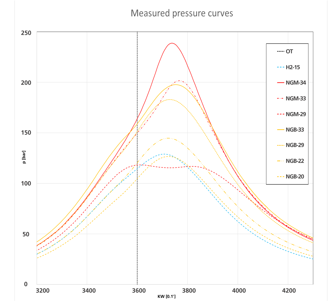Figure 3: Measured pressure curves with different fuels and engine settings