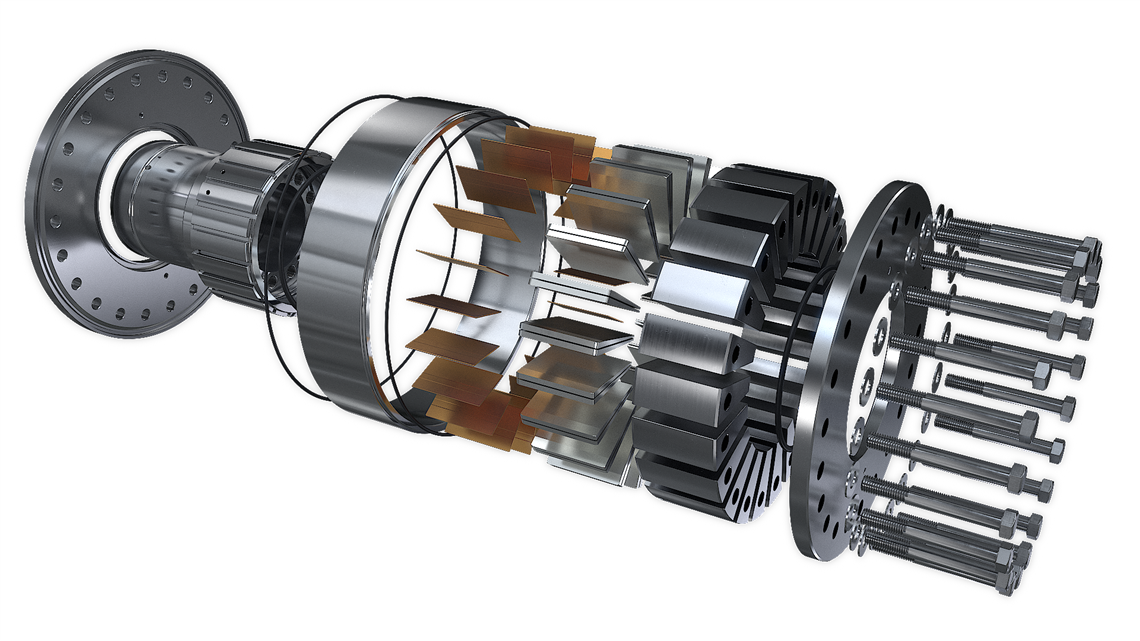 Even hydrogen with a quite low IMEP of 15 bar show, that the TV stress limit of the crankshaft is exceeded without a TV damper. Compared to the diesel engine, a 30% higher TV stress in the crankshaft for hydrogen can be seen, even with a state-of-the-art TV damper. On the other hand, an IMEP of 34 bar show, that even with a special tuned TV Damper the crankshaft is still overloaded. In such a case additional design loops for this application between the engine builder and the damper and coupling supplier are required for further design optimizations. Due to such studies, Geislinger has built up the knowledge to individually optimize the dampers and couplings depending on the engine builders’ concepts. This optimization goes hand in hand with the engine builder in order to achieve highest overall system efficiency and reliability. The image below shows the single components of a tuned spring damper (aka Geislinger Damper), where the steel springs and all other parts can be adapted and built individually to match the design targets and required vibration levels.
