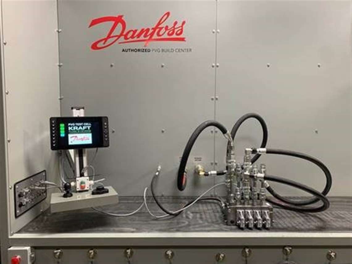 Kraft said it tests 100% of all PVG valve assemblies with capabilities up to 60 gpm and 5000 psi, which the company said satisfies common parameters for modern mobile off-highway equipment. The new Kraft-Danfoss test stand was commissioned in October and is powered by Danfoss components including a D1P high power pump, Plus+1 electronic controls, DM1000 10 in. display, JS1000 joystick, and an HMR CAN rotary screen navigator.