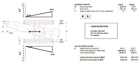Crane back-heavy. If the crane is boomed back to minimum radius with the boom over the front, in this instance the whole length of the track is engaged, but the crane is back-heavy and the peak pressures are about 5 ksf. This might not be acceptable on a site road, so again you would need to verify this.
