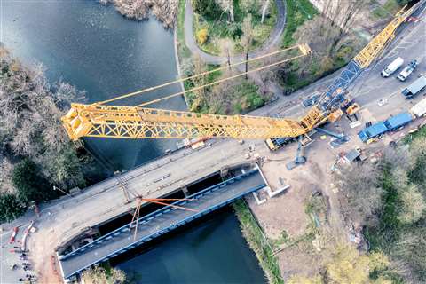 Ainscough Crane Hire lifted a new footbridge into place in Leicester in the UK using a using a Liebherr LG1550 crane and a 100 tonne capacity rigging crane.