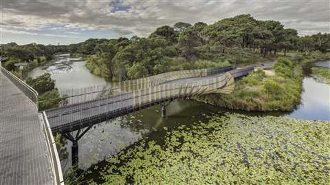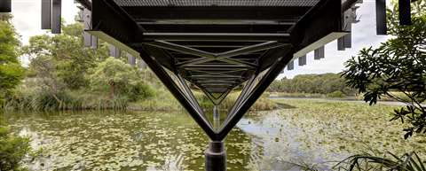 Local spotted gum is used for handrails and kerbs, sandstone for paving and retaining blocks. Lightweight, non-slip fibreglass reinforced plastic mesh (FRP) was selected for the bridge deck.