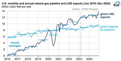 Natural gas exports from the U.S. are expected to climb over the next two years, but the growth in LNG exports is expected to surpass pipeline exports in that timeframe, a recent study has shown. The U.S. Energy Information Administration has forecast that LNG exports will average 12.1 Bcf/d in all of 2023, up 14% from last year. That growth is expected to continue into 2024, when LNG exports will climb an additional 5%.
